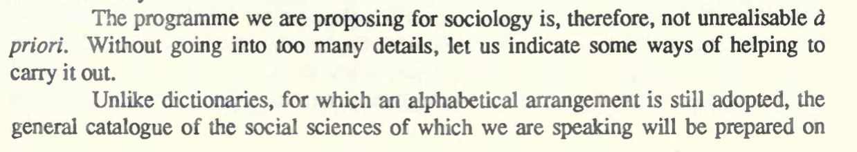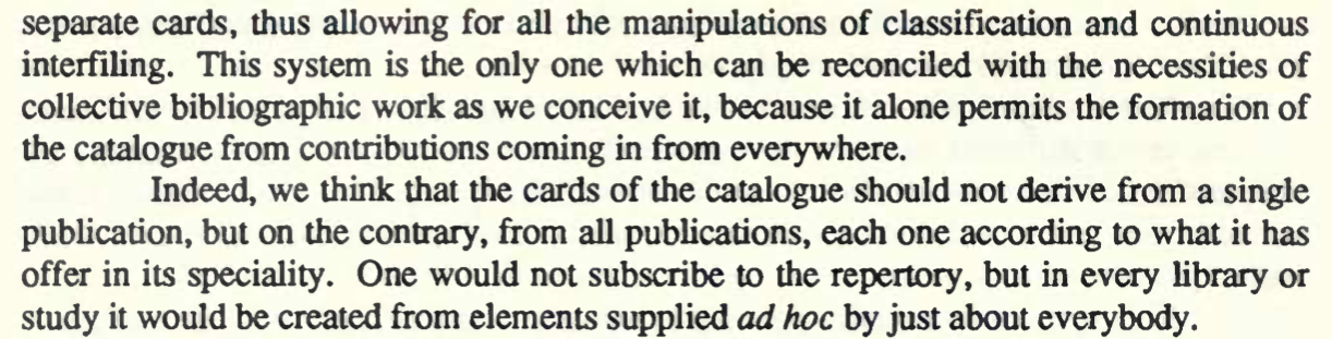 • would be cards containing individual "chunks" of information, that would allow "all the manipulations of classification and continuous interfiling." In addition would be needed "a very detailed synoptic outline of knowledge" that could allow classification of all of these chunks of data.