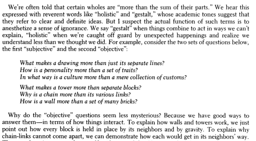 Now it is easy enough to say that the mind is a society, but that idea by itself is useless unless we can say more about how it is organized. If all those specialized parts were equally competitive, there would be only anarchy, and the more we learned, the less we'd be able to do. So there must be some kind of administration, perhaps organized roughly in hierarchies, like the divisions and subdivisions of an industry or of a human political society.